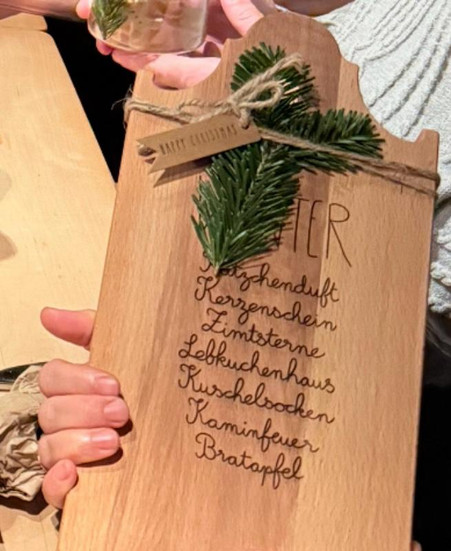 In gemütlicher Runde gab es liebevolle, kleine Überraschungen: handgemachte Küchenbretter und winterliche Dosen 🎁🎄